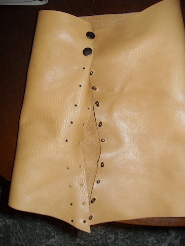 Sul lato opposto piegate il lembo di pelle in modo che i fori combacino e inserite il tutto nei rivetti precedentemente montati, unite poi la testa del rivetto e punzonate il tutto.
